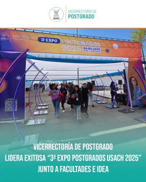 Con una importante convocatoria de público interno y externo a la Universidad de Santiago de Chile, y la presencia de autoridades académicas e integrantes del profesorado del plantel, el 24 de septiembre se desarrolló la 3ª Expo Postgrados USACH 2025, actividad organizada por la Vicerrectoría de Postgrado, en conjunto con facultades y el Instituto de Estudios Avanzados (IDEA-USACH), entidades que difundieron su respectiva oferta de Doctorados y Magísteres, en el marco de un evento que contó, además, con charlas de académicos, entretenidos concursos y módulos informativos institucionales.