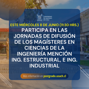 Con el fin de dar a conocer en profundidad las propuestas académicas de dos programas de postgrado de la Facultad de Ingeniería de la Universidad de Santiago de Chile, que se encuentran acreditados y tienen postulaciones abiertas, –el Magíster en Ciencias de la Ingeniería mención Ingeniería Estructural y el Magíster en Ciencias de la Ingeniería mención Ingeniería Industrial- tendrán lugar dos jornadas de difusión en paralelo el miércoles 8 de junio a las 11:30 horas en las que participarán directores/as, académicos/as y estudiantes.